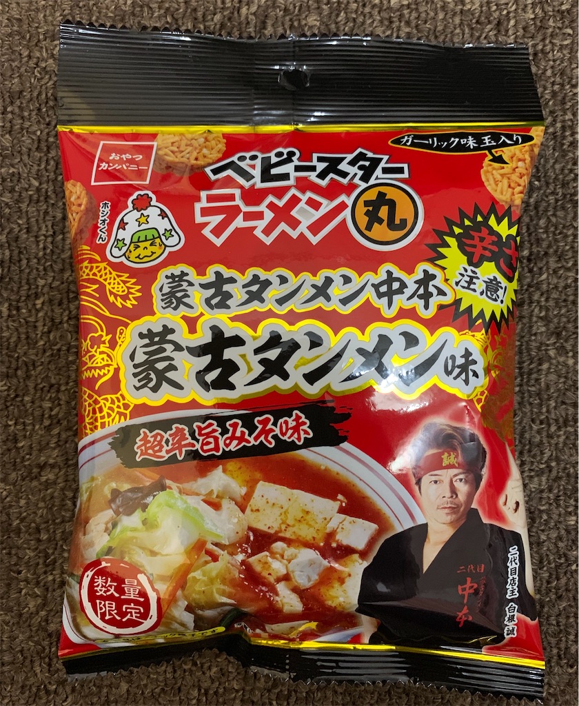 まずは「ラーメン丸」とのコラボの「蒙古タンメン味」(税込127円)です。